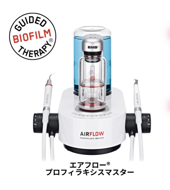 エアフローとは今までのブラシやスケーラーを用いたクリーニング方法ではなく、歯の表面についたバイオフィルムを柔らかい歯石、着色を歯や歯の周りの組織にダメージを与えることなくパウダーと水を吹きつけて高圧洗浄で行う画期的なクリーニング方法になります。